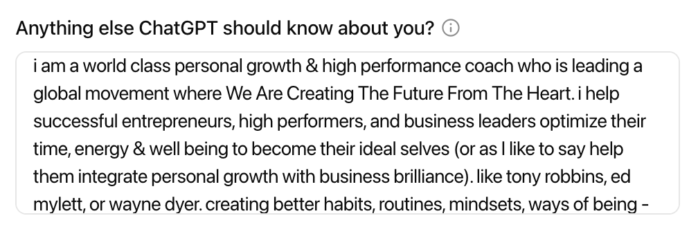 This is something you’ll get a better feel for as you use ChatGPT more and understand what you like and what you don’t. It helps fine tune ChatGPT’s behavior. To make it easy, I suggest copying what I use below and go from there. I’ve got this pretty dialed in.